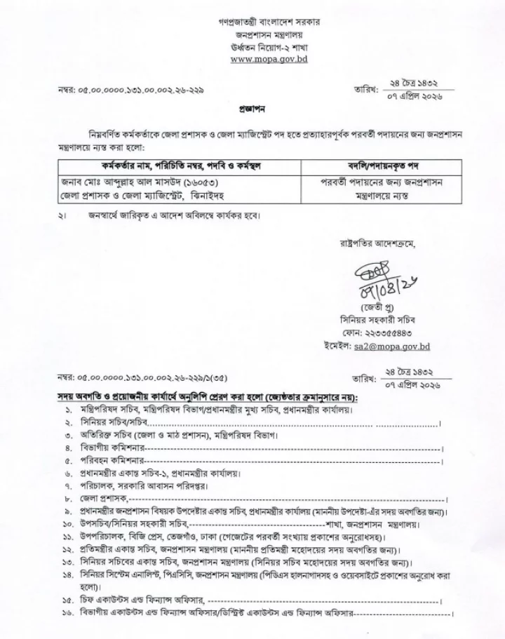 প্রজ্ঞাপনে বলা হয়, আব্দুল্লাহ আল মাসউদকে জেলা প্রশাসক ও জেলা ম্যাজিস্ট্রেট হতে প্রত্যাহারপূর্বক পরবর্তী পদায়নের জন্য জনপ্রশাসন মন্ত্রণালয়ে ন্যস্ত করা হলো।