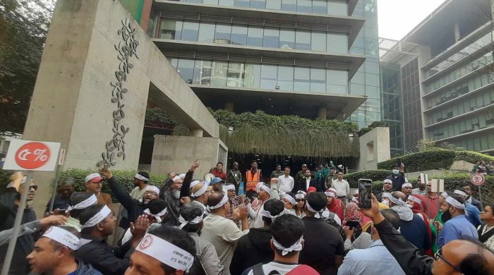 স্বৈরতান্ত্রিকভাবে চাকরিচ্যুত এবং ছাঁটাই করা শ্রমিকদের কাজে পুনর্বহাল ও মুনাফার ৫ শতাংশ বিলম্ব জরিমানাসহ ন্যায্য পাওনার দাবিতে বসুন্ধরায় গ্রামীণ ফোনের প্রধান কার্যালয়ের সামনে অবস্থান নিয়েছেন গ্রামীণফোনের চাকুরিচ্যুতরা। আজ মঙ্গলবার (৪ ফেব্রুয়ারি)