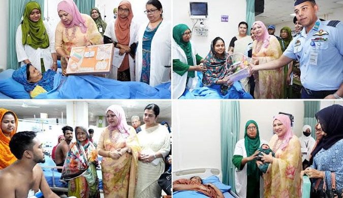 বাংলাদেশ বিমান বাহিনী মহিলা কল্যাণ সমিতি (বাফওয়া) ও আদার্স উইমেন এন্ড চিলড্রেন ক্লাবের সভানেত্রী সালেহা খান বৈষম্যবিরোধী ছাত্র আন্দোলনে আহত ছাত্র-ছাত্রী ও চলমান বন্যা কবলিত এলাকা থেকে উদ্ধারকৃত আহত ও