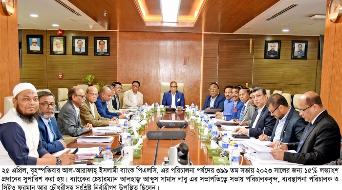 আল-আরাফাহ্ ইসলামী ব্যাংক পিএলসি. সদ্য সমাপ্ত ২০২৩ সালের জন্য ১৫% লভ্যাশ ঘোষণা করেছে। এর মধ্যে ১০% নগদ ও ৫% স্টক বোনাস রয়েছে। ২৫ এপ্রিল, ২০২৪ বৃহস্পতিবার অনুষ্ঠিত পরিচালনা পর্ষদের