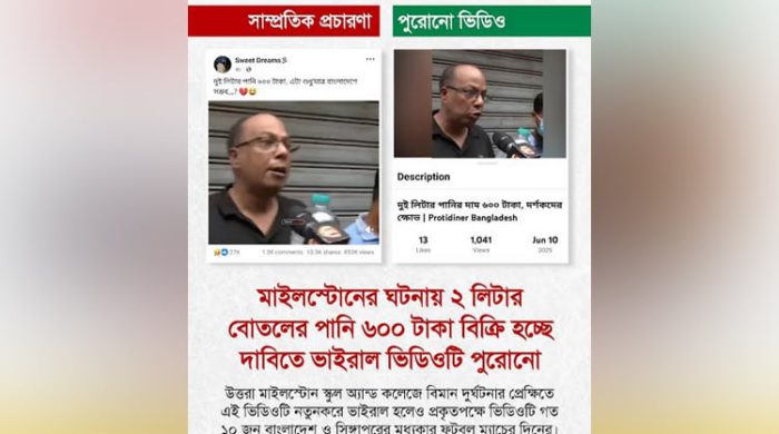 রাজধানী উত্তরার বিমান দুর্ঘটনার পর হতাহতের ঘটনার প্রেক্ষাপটে ‘২ লিটার পানির বোতল ৬০০ টাকায় বিক্রি’-এই ভুয়া ও বিভ্রান্তিকর তথ্য সামাজিক যোগাযোগ মাধ্যমে ছড়িয়ে পড়েছে। এ ধরনের অপপ্রচার ও অপতথ্য শনাক্ত