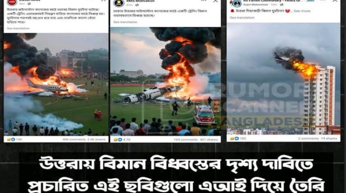 রাজধানী উত্তরার বিমান বিধ্বস্তের ঘটনাকে কেন্দ্র করে কৃত্রিম বুদ্ধিমত্তা (এআই)-র সাহায্যে তৈরি ভুয়া ছবি সামাজিক মাধ্যমে ছড়িয়ে ভ্রান্তিকর প্রচার ও অপতথ্য ছড়ানো হচ্ছে। এমন তথ্য শনাক্ত করেছে ফ্যাক্টচেকিং প্ল্যাটফর্ম রিউমার