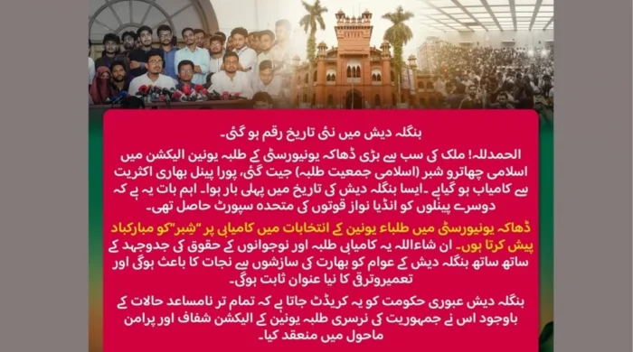 ঢাকা বিশ্ববিদ্যালয়ের কেন্দ্রীয় ছাত্র সংসদ (ডাকসু) ও হল সংসদ নির্বাচনে ইসলামী ছাত্রশিবির সমর্থিত ঐক্যবদ্ধ প্যানেল বিজয়ী হওয়ায় পাকিস্তান জামায়াতে ইসলামী শুভেচ্ছা জানিয়েছে। দলটির অফিসিয়াল ফেসবুক পেজে বুধবার (১০ সেপ্টেম্বর) প্রকাশিত