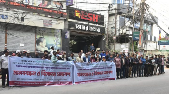 দৈনিক ভোরের কাগজ থেকে কর্মরত সাংবাদিক-কর্মচারীদের ছাঁটাই করে ডিক্লারেশন বাঁচাতে ক্ষুদ্র একটি টিম নিয়ে পত্রিকা প্রকাশের উদ্যোগের প্রতিবাদে আন্দোলনে নেমেছেন পত্রিকার সাংবাদিক-কর্মচারীরা। রাজধানীর মালিবাগের মৌচাক এলাকায় ভোরের কাগজ অফিসের সামনে