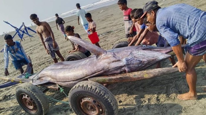 কক্সবাজারের টেকনাফে বঙ্গোপসাগরে জেলেদের জালে প্রায় ৪০০ কেজি ওজনের বিরল প্রজাতির একটি তলোয়ার মাছ ধরা পড়েছে। বুধবার সকালে টেকনাফের শামলাপুর পুরানপাড়া ঘাটে জেলেদের জালে মাছটি ধরা পড়ে। স্থানীয় জেলে আবু