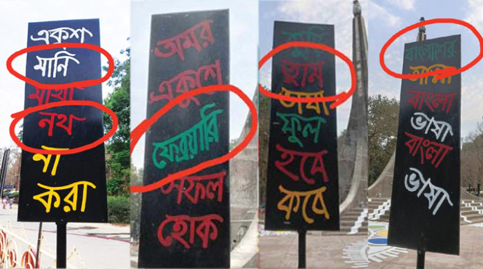 অমর একুশে ফেব্রুয়ারি উপলক্ষে চট্টগ্রাম বিশ্ববিদ্যালয়ের (চবি) কেন্দ্রীয় শহীদ মিনার এলাকায় বসানো ভুল বানানের প্ল্যাকার্ডগুলো নিয়ে সামাজিক যোগাযোগমাধ্যমে সমালোচনা চলছে। সেখানে থাকা ১১টি প্ল্যাকার্ডেই ভুল বানান দেখা গেছে।