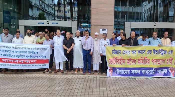 শতবর্ষী বাণিজ্য সংগঠন চট্টগ্রাম চেম্বারকে স্বৈরশাসন ও পরিবারতন্ত্র থেকে মুক্ত করার দাবিতে সাধারণ ব্যবসায়ীরা বিক্ষোভ সমাবেশ করেছেন। আজ রোববার (১৮ আগস্ট) সকালে আগ্রাবাদের ওয়ার্ল্ড ট্রেড সেন্টারের সামনে বৈষম্যের শিকার ব্যবসায়ীরা