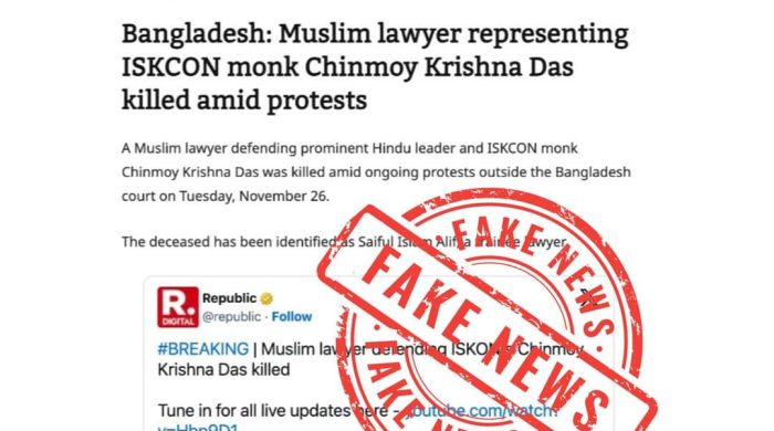 চট্টগ্রামে নির্মমভাবে খুন হওয়া আইনজীবী সাইফুল ইসলাম আলিফকে চিন্ময় কৃষ্ণ দাসের আইনজীবী বলে দাবি করে কিছু ভারতীয় গণমাধ্যম অপপ্রচার চালাচ্ছে বলে জানিয়েছে প্রধান উপদেষ্টার প্রেস উইং। প্রধান উপদেষ্টার প্রেস উইং