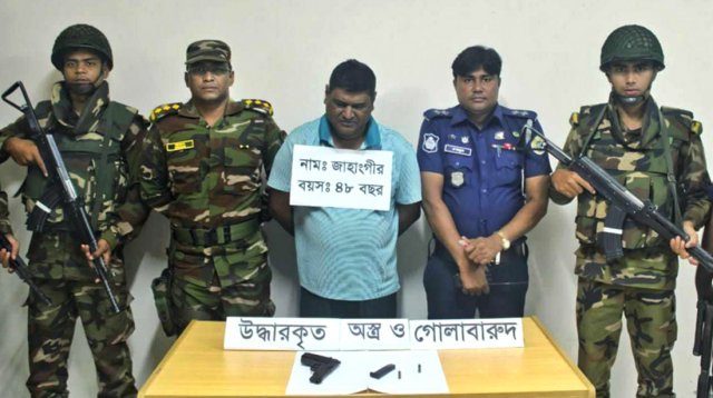 পটুয়াখালীতে মির্জাগঞ্জে বিদেশি পিস্তল ও গুলিসহ বিএনপি নেতা মো. জাহাঙ্গীর ফরাজিকে আটক করেছে যৌথ বাহিনী। আজ বৃহস্পতিবার (৭ নভেম্বর) ভোরে মির্জাগঞ্জ উপজেলার উত্তর সুবিদখালী এলাকার নিজ বাসা থেকে তাকে আটক