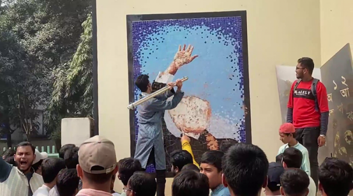 শেখ হাসিনার ভাষণের প্রতিবাদ ও নিষিদ্ধ সংগঠন ছাত্রলীগের গ্রেফতার নেতাদের রিমান্ড শুনানিকে কেন্দ্র করে নরসিংদী আদালত প্রাঙ্গণে বঙ্গবন্ধু শেখ মুজিবুর রহমান ও সাবেক শিল্পমন্ত্রী নুরুল মজিদ মাহমুদ হুমায়নের ম্যুরাল ভাঙচুর