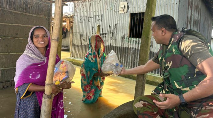 অতিবৃষ্টি ও পাহাড়ি ঢলে সৃষ্ট বন্যাকবলিত ময়মনসিংহের সীমান্তবর্তী ধোবাউড়া উপজেলা পরিদর্শন করেছেন সেনাবাহিনীর সদস্যরা। এ সময় দুর্গম এলাকার পানিবন্দি পরিবারগুলোতে ত্রাণ বিতরণ করেন তারা। আজ সোমবার (৭ অক্টোবর) দুপুরে উপজেলার
