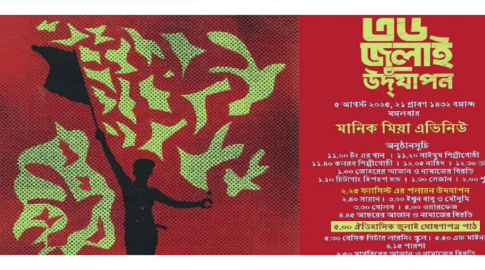আগামী ৫ আগস্ট বিকেল ৫টায় রাজধানীর মানিক মিয়া অ্যাভিনিউয়ে উপস্থাপন করা হবে আলোচিত ‘জুলাই ঘোষণাপত্র’। দিনব্যাপী ‘৩৬ জুলাই উদ্যাপন’ অনুষ্ঠানের অংশ হিসেবে এই ঘোষণা পাঠ করা হবে। আজ রোববার (৩