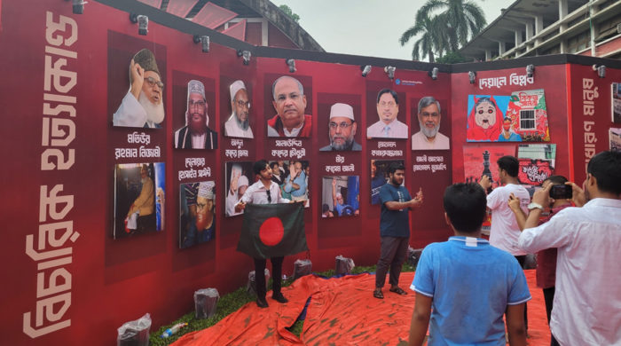 ঢাকা বিশ্ববিদ্যালয়ের টিএসসির পায়রা চত্বরে জুলাই গণঅভ্যুত্থানের বর্ষপূর্তি উপলক্ষে আয়োজিত ‘৩৬ জুলাই: আমরা থামবো না’ শীর্ষক কর্মসূচির অংশ হিসেবে একাত্তরের যুদ্ধাপরাধে দণ্ডিত নেতাদের ছবির প্রদর্শনী করে ইসলামী ছাত্রশিবির। এর প্রতিবাদে
