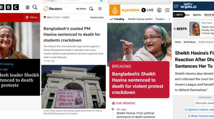 ২০২৪ এর জুলাই গণ-অভ্যুত্থানের সময় সংঘটিত মানবতাবিরোধী অপরাধের দায়ে শেখ হাসিনাকে মৃত্যুদণ্ডের আদেশ দিয়েছেন আন্তর্জাতিক অপরাধ ট্রাইব্যুনাল-১। বিষয়টি গুরুত্ব সহকারে প্রকাশ করছে বিভিন্ন আন্তর্জাতিক সংবাদমাধ্যম। ‘বাংলাদেশের সাবেক প্রধানমন্ত্রী শেখ হাসিনাকে